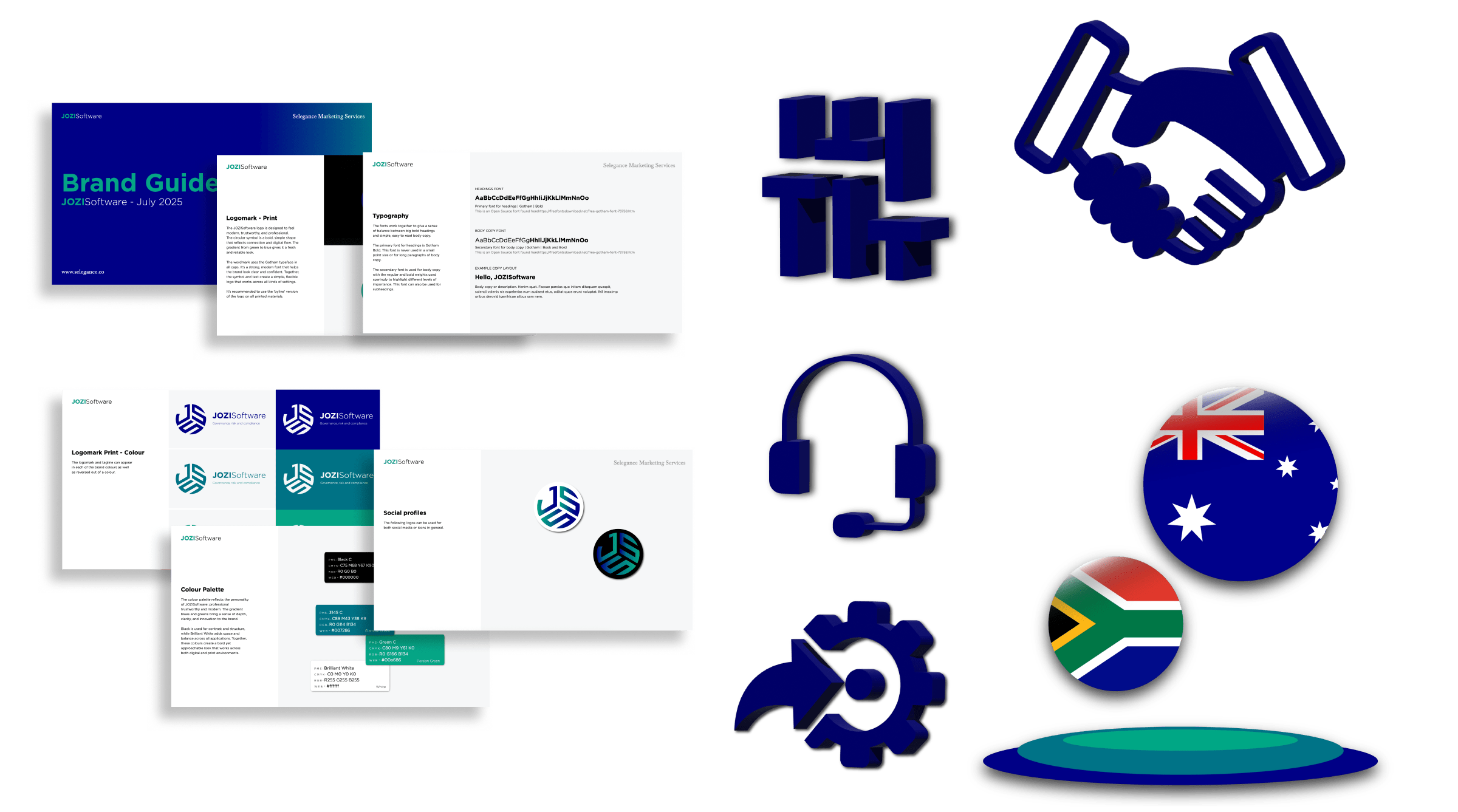 We began by defining the foundation of Jozi Software’s brand identity. The process started with creating a full brand identity, including a colour palette built on deep blues (trust and authority) and fresh greens (growth and progress), paired with the Gotham typeface for clarity and modernity. We then created a modern, versatile logo that communicates structure, reliability, and innovation, perfectly suited for the B2B SaaS and tech industry.